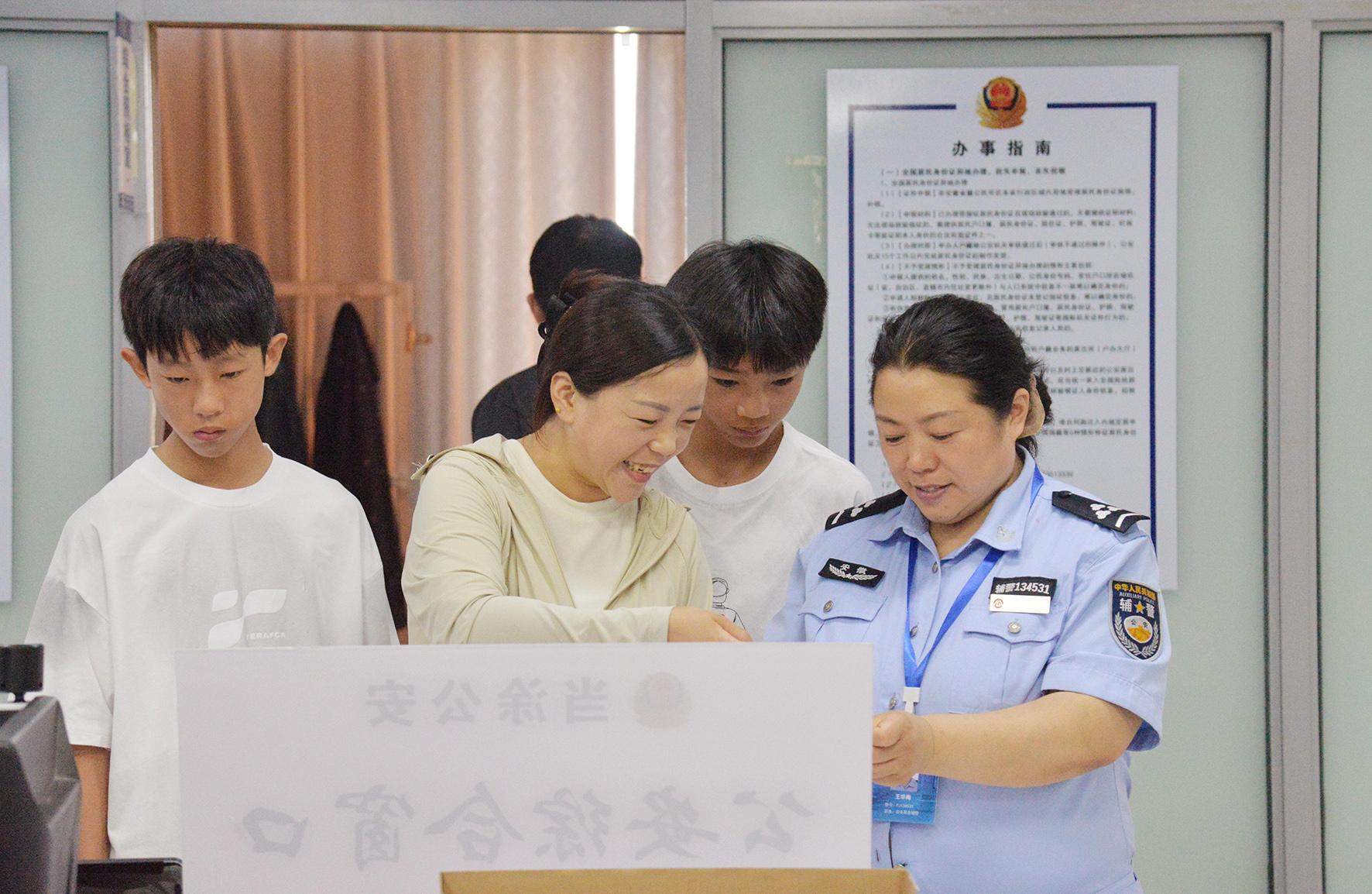 暑期來(lái)臨,安徽省當(dāng)涂縣政務(wù)中心公安窗口迎來(lái)了新一輪的辦證高峰。7月1日,當(dāng)涂縣公安局駐縣政務(wù)服務(wù)中心公安綜合服務(wù)窗口輔警為市民辦理業(yè)務(wù)。