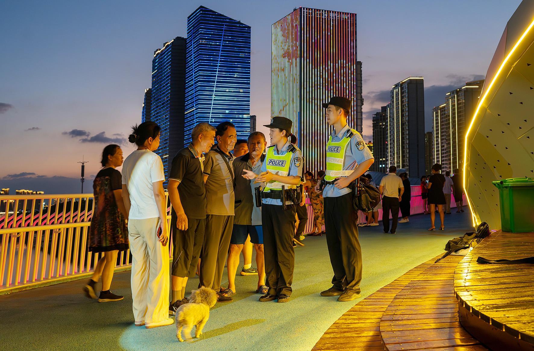 圖為7月3日晚,民警在永寧江景觀橋巡邏,并向群眾宣傳夏季安全防護知識。
