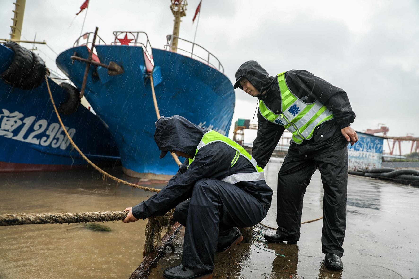 7月8日,今年第4號臺風(fēng)“丹娜絲”逼近浙江沿海,浙江省臺州市公安局椒江分局前所派出所民警輔警深入碼頭開展抗臺風(fēng)工作。