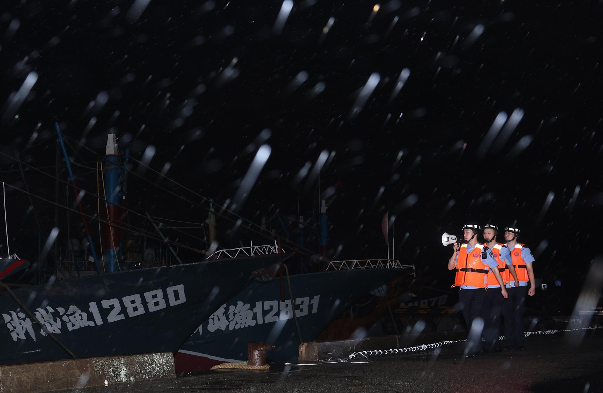 今年第8號臺風“竹節(jié)草”逼近浙江沿海,7月29日,浙江省岱山縣公安局高亭派出所民警進漁村、入碼頭、上漁船(排),通過高音喇叭、逐船檢查等形式排查安全隱患,進一步筑牢防臺風“警戒線”。