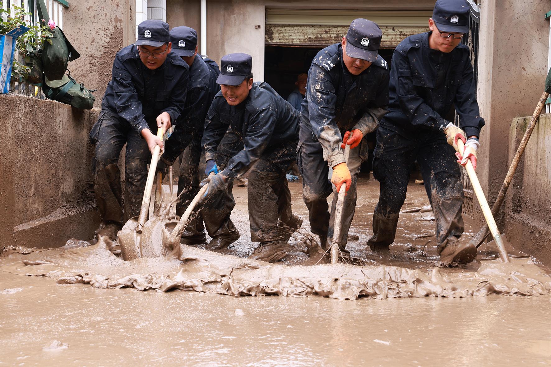 8月8日,甘肅省蘭州市公安局民警在甘肅省蘭州市榆中縣城關(guān)鎮(zhèn)興隆山村清理淤泥。8月7日至8日,榆中縣等地遭遇連續(xù)強(qiáng)降雨,引發(fā)山洪災(zāi)害,榆中縣城關(guān)鎮(zhèn)、馬坡鄉(xiāng)、小康營鄉(xiāng)、夏官營鎮(zhèn)等多個鄉(xiāng)鎮(zhèn)受災(zāi)。