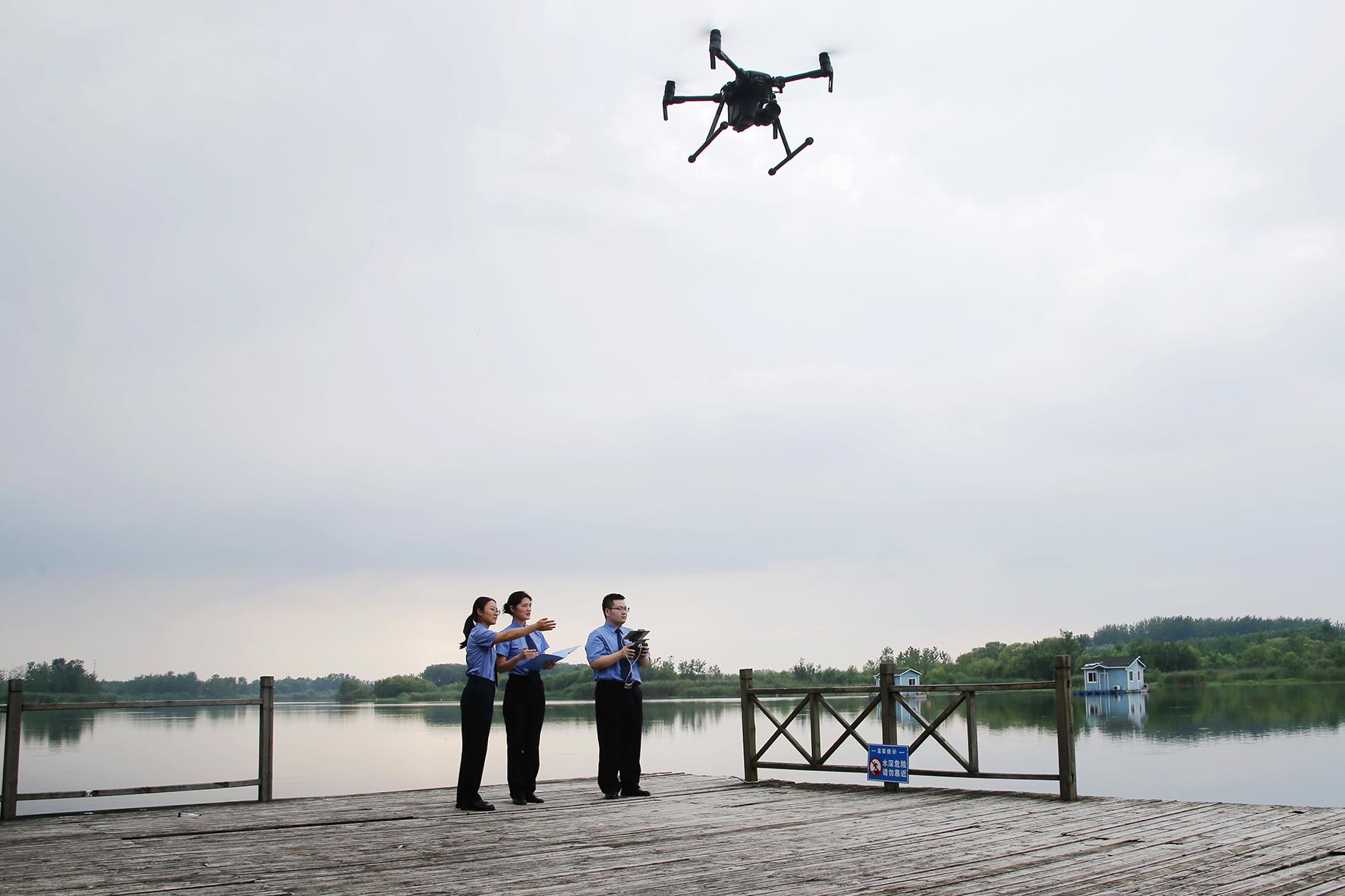 圖為8月12日,在全國生態(tài)日到來之際,公益訴訟辦案團(tuán)隊(duì)對古黃河飲用水源地開展無人機(jī)巡查。