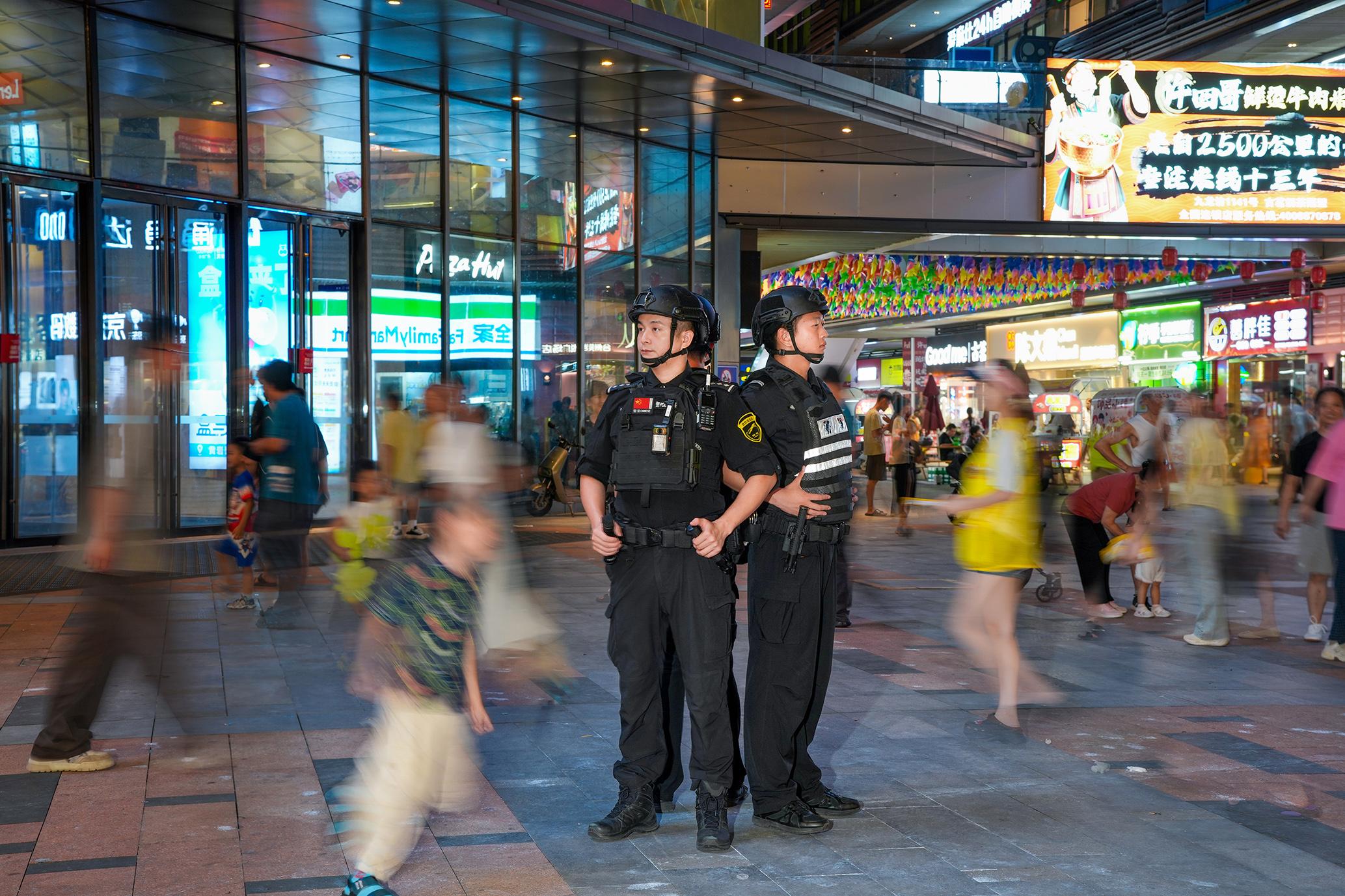 圖為8月12日夜晚,巡特警大隊(duì)民警在商業(yè)廣場巡邏執(zhí)勤。
