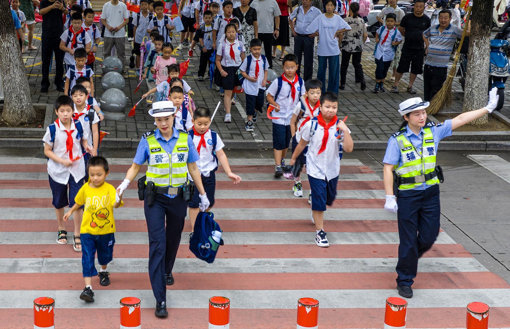 9月1日,安徽省廬江縣公安局交管大隊(duì)女子“護(hù)學(xué)崗”民輔警在城關(guān)小學(xué)門前維護(hù)交通秩序,護(hù)送孩子們平安進(jìn)校園。