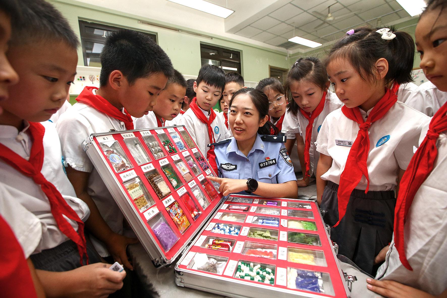 9月1日,山東省濟(jì)南市公安局市中分局民警來到愛都小學(xué)利用仿真毒品模型給學(xué)生講解禁毒常識。