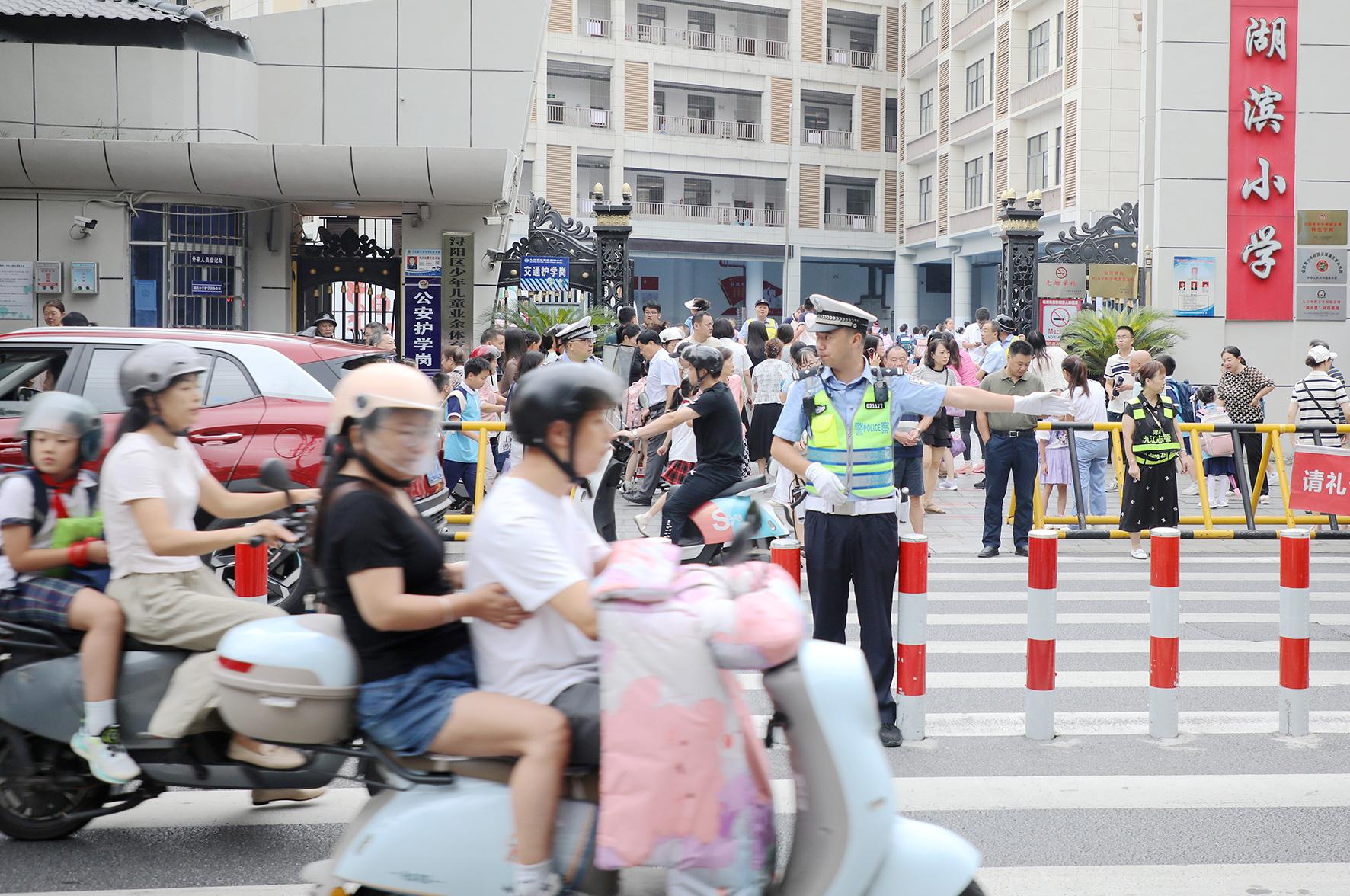 9月1日,江西省九江市公安局交管支隊(duì)潯陽大隊(duì)民輔警在轄區(qū)學(xué)校門口維護(hù)秩序。
