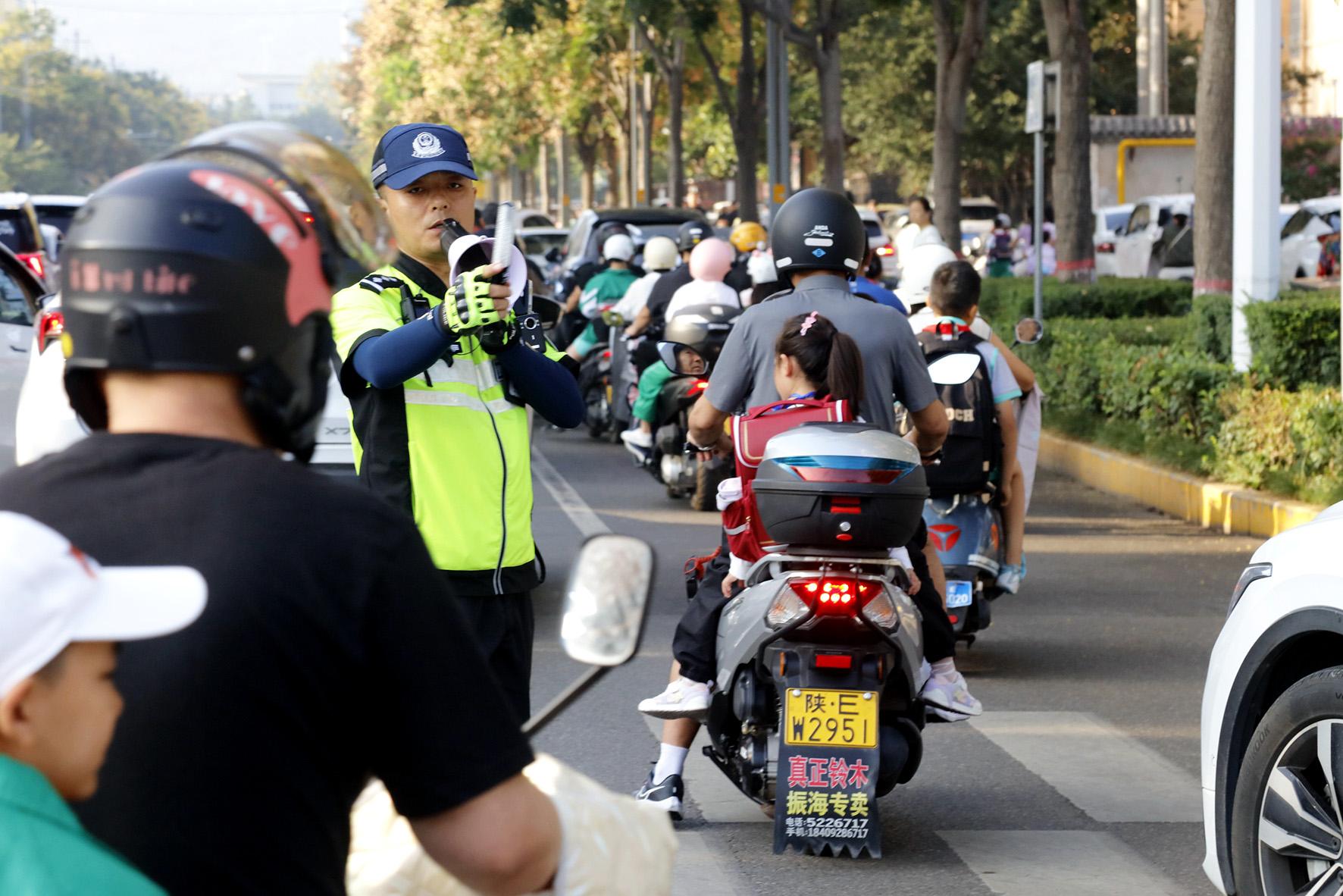 9月1日,陜西省渭南市公安局交警支隊(duì)臨渭大隊(duì)民警在渭南市實(shí)驗(yàn)小學(xué)十字路口指揮疏導(dǎo)車輛。