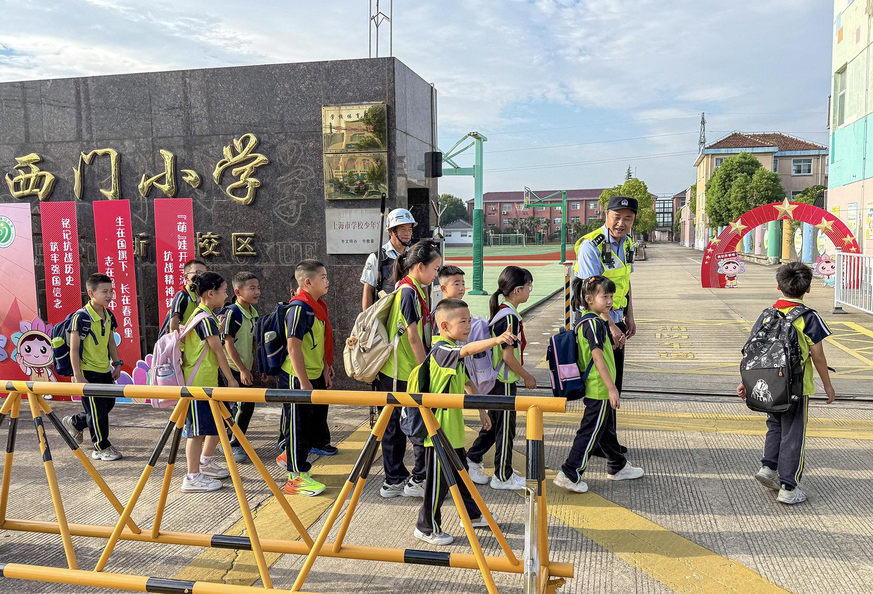 9月1日開學(xué)首日,上海市公安局崇明分局新村派出所民警開展護(hù)校安園工作。