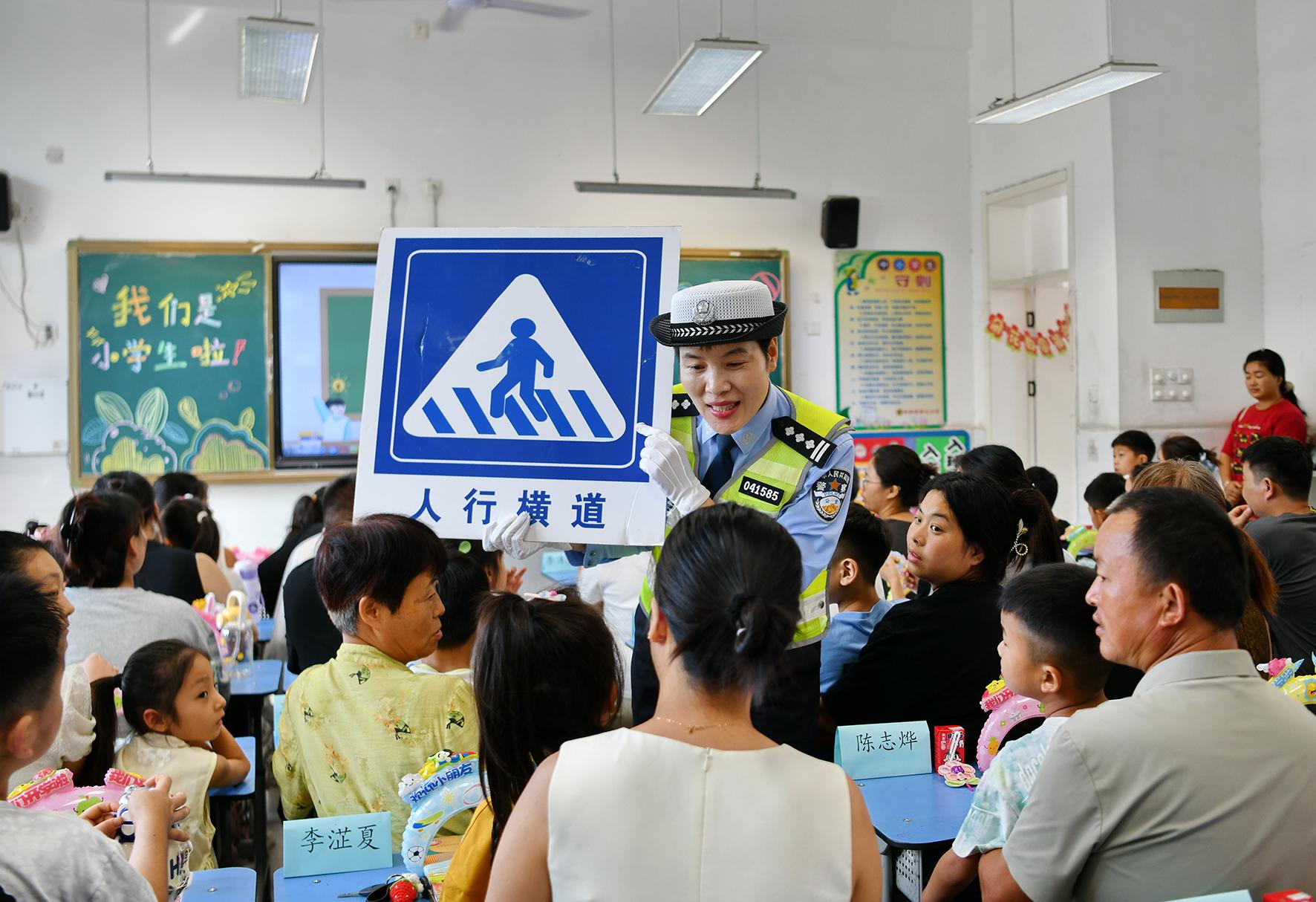 9月1日,安徽省阜南縣公安局交管大隊(duì)“護(hù)學(xué)崗”民警在第三小學(xué)向一年級新生和家長們宣講出行安全知識。