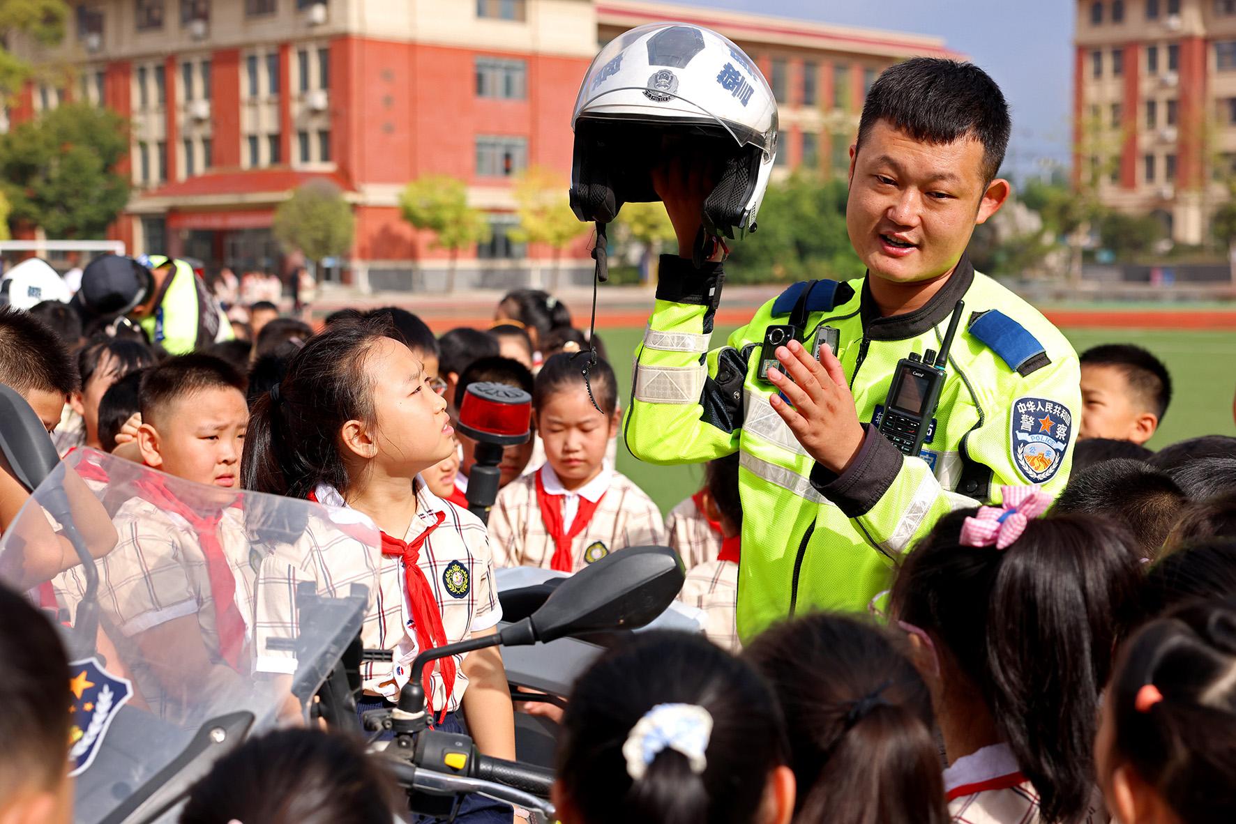 9月1日,山東省棗莊市公安局市中分局交通管理大隊(duì)鐵騎隊(duì)員在東湖小學(xué)向?qū)W生們普及交通安全知識。