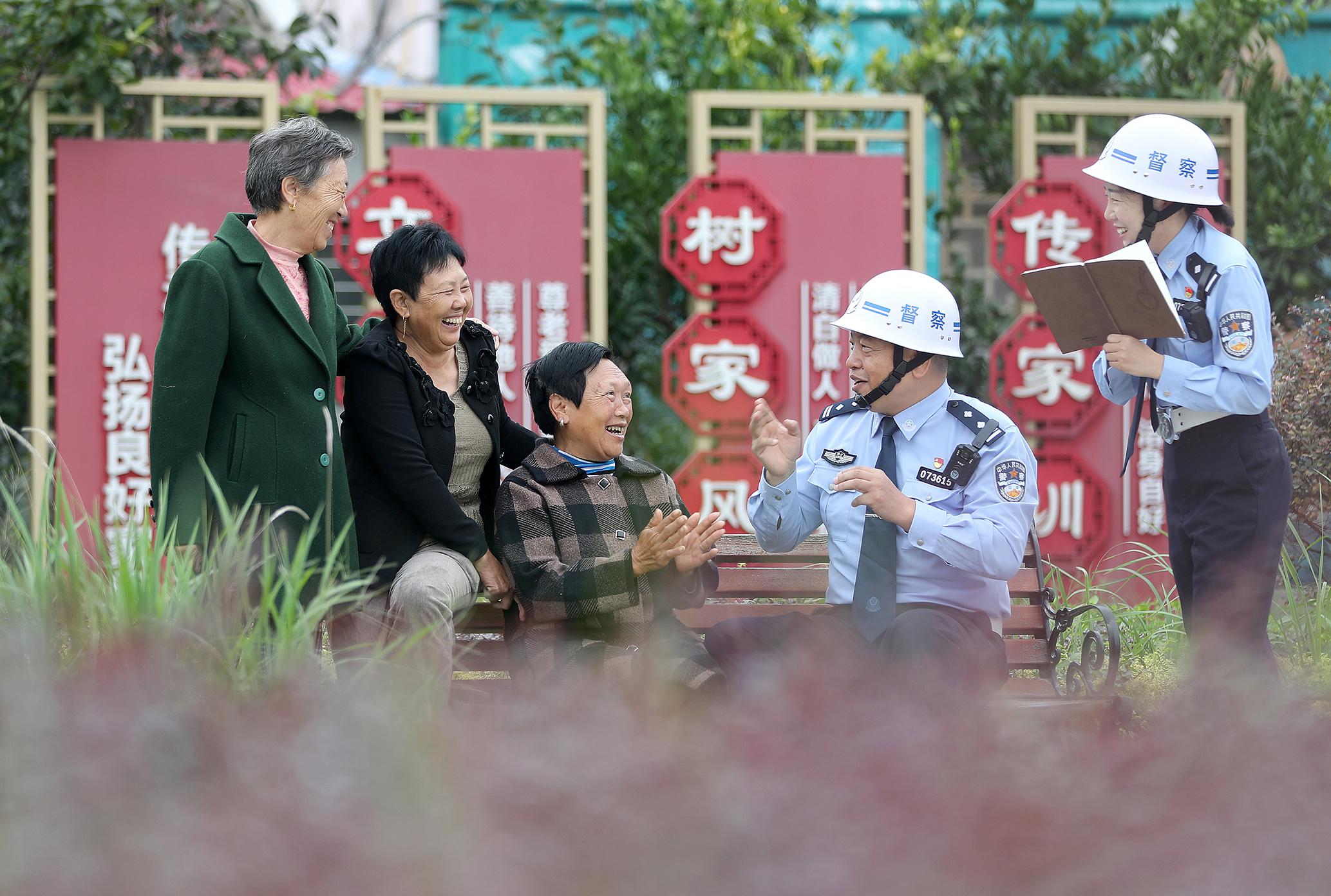 9月22日,在湖北省荊門市沙洋縣三峽土家族村,沙洋縣公安局督察大隊民警與村民“嘮家?!?,傾聽群眾對公安服務的需求與建議。