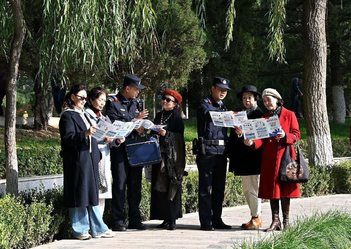 10月28日,甘肅省蘭州市公安局安寧分局劉家堡派出所民輔警走進(jìn)蘭州市植物園,結(jié)合近期高發(fā)的電詐案例向中老年群眾講解防詐技巧。
