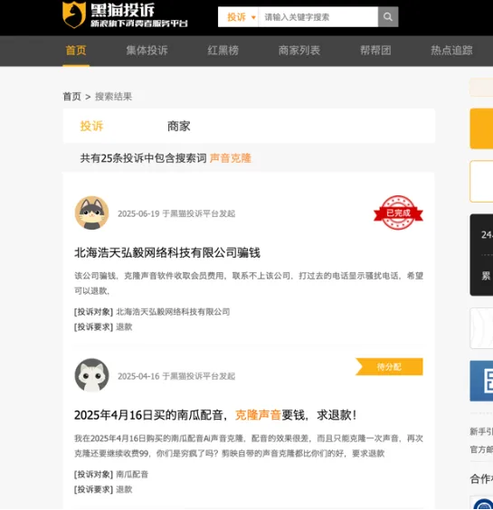 不過(guò),在眾多此類工具中,也不乏有用戶使用后受騙的例子。記者在黑貓平臺(tái)搜索“聲音克隆”發(fā)現(xiàn),有多名用戶曾對(duì)此進(jìn)行投訴。