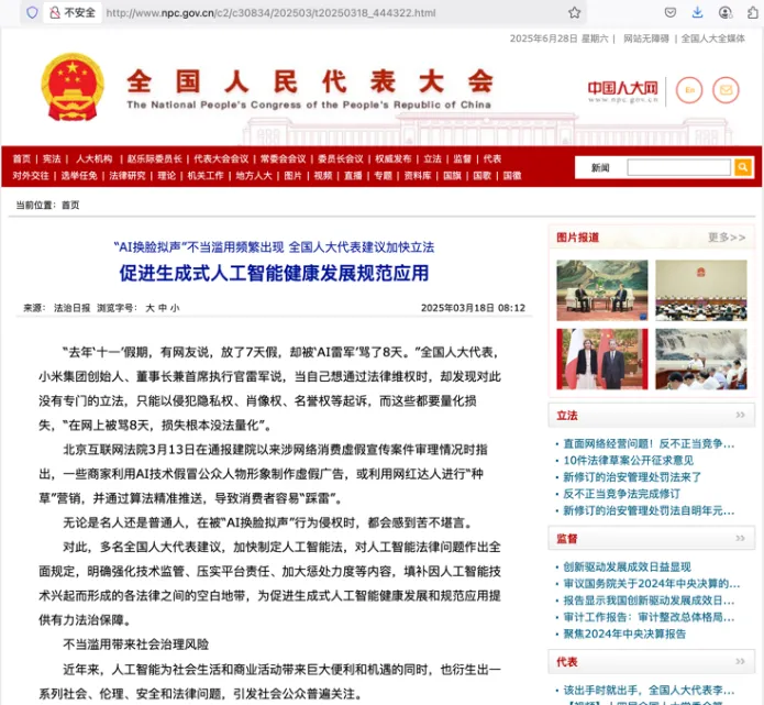隨著“AI換臉擬聲”亂象日益突出,社會(huì)各界呼吁對(duì)此加強(qiáng)監(jiān)管和治理的呼聲也越來(lái)越高,今年全國(guó)兩會(huì)期間,多名全國(guó)人大代表就紛紛建議,加強(qiáng)治理AI換臉擬聲。