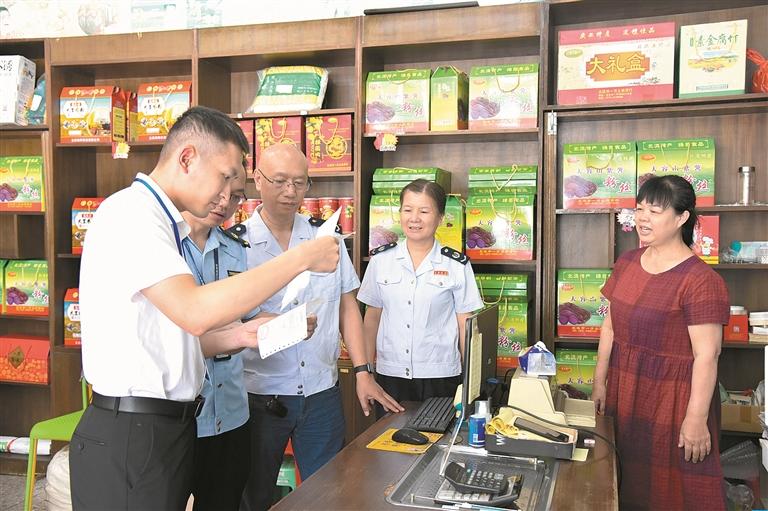 廣西壯族自治區(qū)北流市紀委監(jiān)委聚焦隱形變異“四風”問題,聯(lián)合稅務、市場監(jiān)督管理等部門組建監(jiān)督檢查組,深挖細查違規(guī)收送節(jié)禮等違反中央八項規(guī)定精神問題。圖為近日,該市監(jiān)督檢查組到轄區(qū)內的土特產店了解有關情況。李桂泉 攝