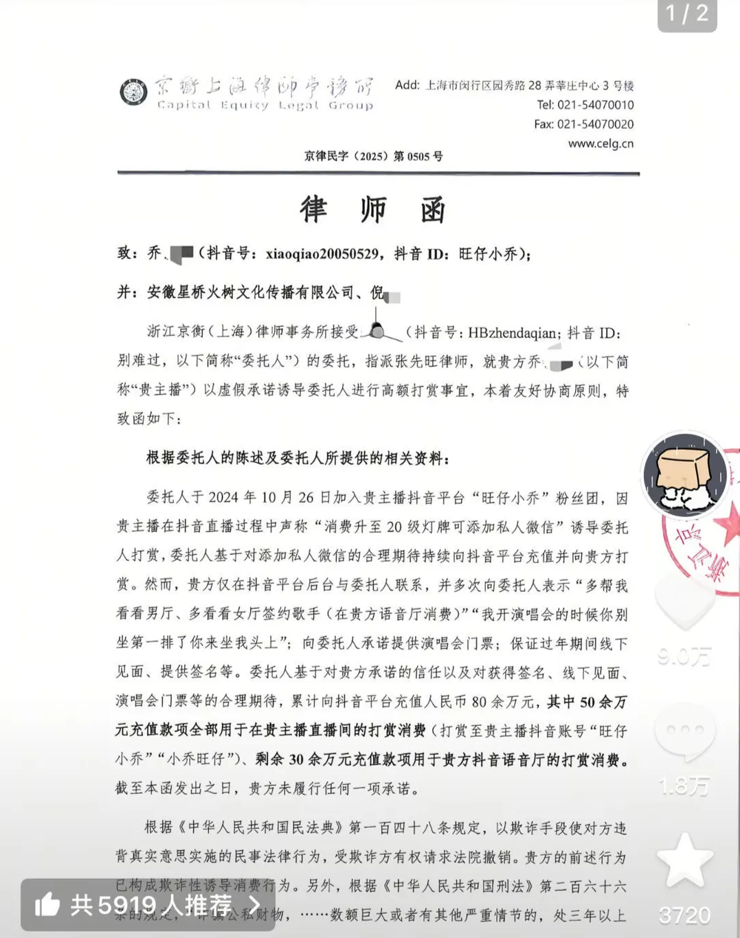 稱(chēng)要求其全額返還充值打賞款80萬(wàn)元,