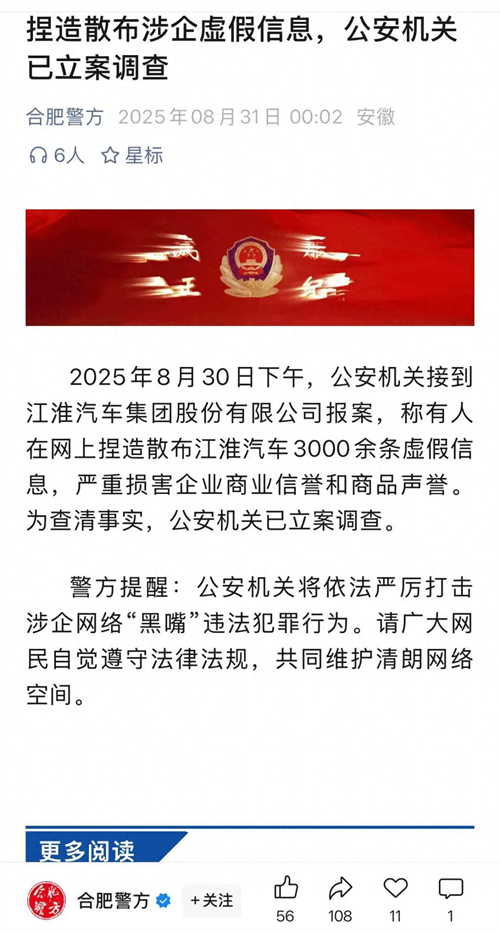 8月31日凌晨,“合肥警方”微信公眾號(hào)發(fā)文稱,2025年8月30日下午,公安機(jī)關(guān)接到江淮汽車集團(tuán)股份有限公司報(bào)案,稱有人在網(wǎng)上捏造散布江淮汽車3000余條虛假信息,嚴(yán)重?fù)p害企業(yè)商業(yè)信譽(yù)和商品聲譽(yù)。為查清事實(shí),公安機(jī)關(guān)已立案調(diào)查。