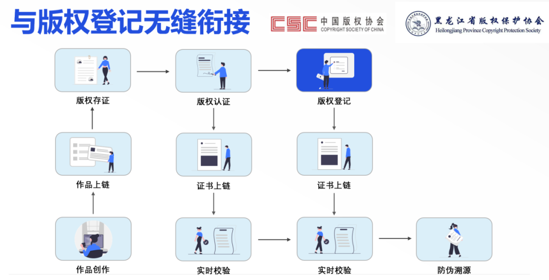 在此基礎上,進一步加強版權確權和保護效率,黑龍江版權保護協(xié)會和中國版權協(xié)會的中國版權鏈達成戰(zhàn)略合作。結合區(qū)塊鏈技術,進行數字版權登記,實現(xiàn)了版權存證、認證和版權登記的無縫銜接,大大提升了版權登記的數字化水平和版權登記效率。并積極探索AIGC領域的權利認定等前沿問題。