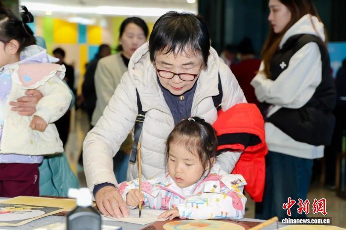 當(dāng)天,宋慶齡青少中心一層中庭熱鬧非凡,書法、國(guó)畫、版畫三大傳統(tǒng)藝術(shù)體驗(yàn)區(qū)同步開放,吸引眾多長(zhǎng)輩參與。書法區(qū)墨香陣陣,“?!薄皦邸薄爸仃?yáng)安康”等臨摹帖整齊擺放,長(zhǎng)者握筆書寫,教師在一旁細(xì)心指導(dǎo)握筆姿勢(shì),不少作品中留下了對(duì)晚輩的溫情祝福。