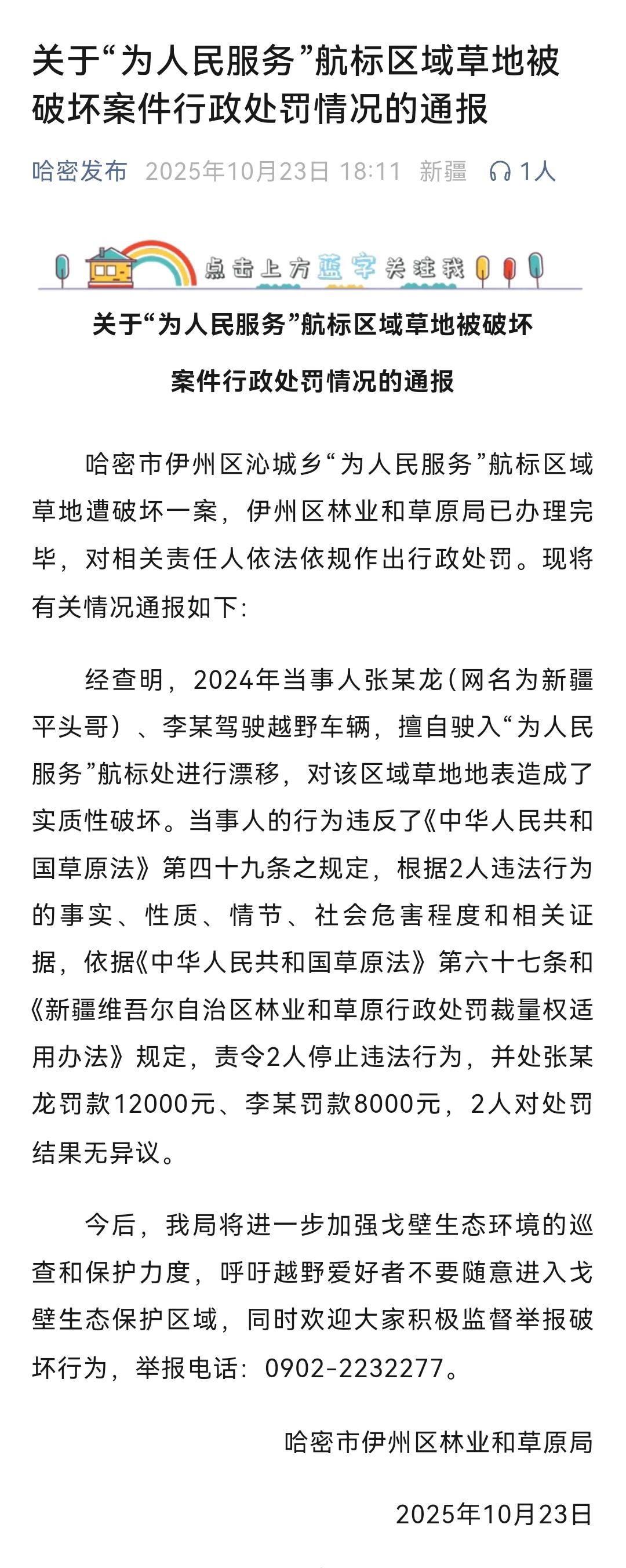 哈密市伊州區(qū)沁城鄉(xiāng)“為人民服務(wù)”航標(biāo)區(qū)域草地遭破壞一案,伊州區(qū)林業(yè)和草原局已辦理完畢,對(duì)相關(guān)責(zé)任人依法依規(guī)作出行政處罰。