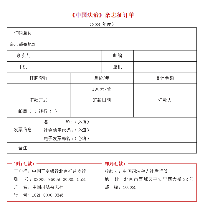 ★若不能進行在線提交訂單,請將本征訂單填寫完整后與匯款憑證一并發(fā)郵件至zgfzfxb@moj.gov.cn;或添加微信13671053926后發(fā)送電子版征訂單與匯款憑證。
