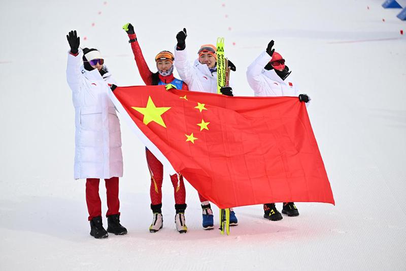 2月13日,中國隊(duì)選手褚源蒙、孟繁棋、唐佳琳、文穎(從左到右)在賽后慶祝。新華社記者 謝劍飛 攝