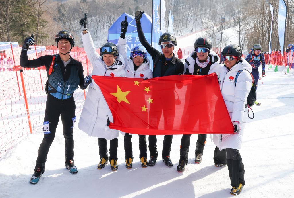 2月12日,中國隊(duì)選手在滑雪登山混合接力決賽后合影慶祝。新華社記者 楊青 攝