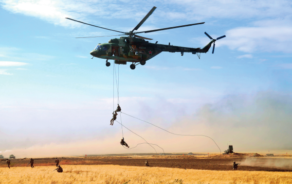 在俄羅斯奧倫堡州東古茲靶場舉行的“和平使命-2021”上海合作組織聯(lián)合反恐軍事演習實兵實彈演習中,多國聯(lián)合部隊特戰(zhàn)分隊執(zhí)行索降作戰(zhàn)任務(資料照片) 梅世雄攝/本刊