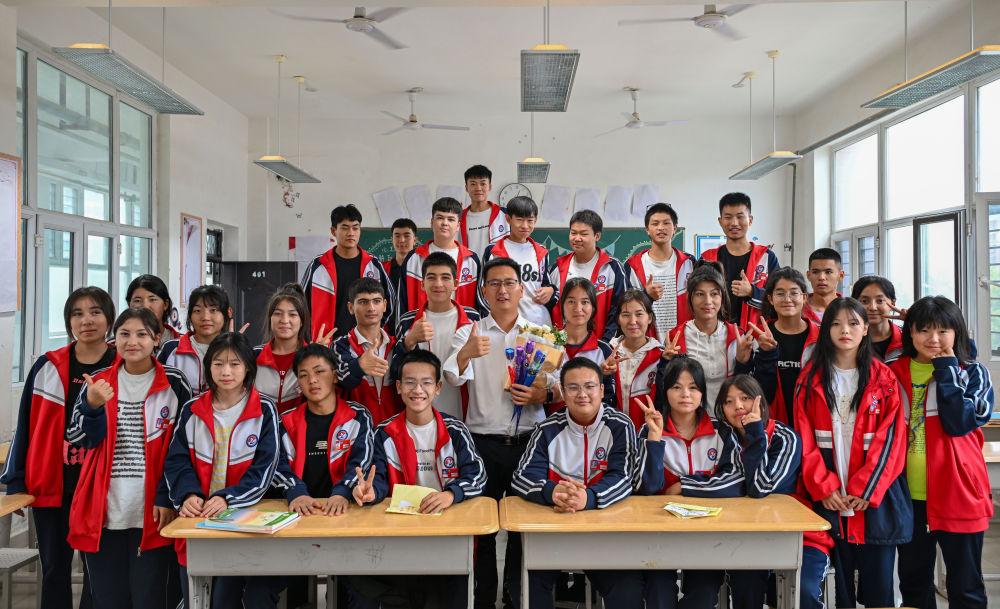 2024年9月10日,在新疆阿拉爾職業(yè)技術(shù)學(xué)校,援疆教師李斌傲(中)和23級(jí)電商班的學(xué)生合影。“95后”年輕教師李斌傲是第十一批浙江臺(tái)州到新疆阿拉爾職業(yè)技術(shù)學(xué)校援疆教師中的一員,負(fù)責(zé)教授電子商務(wù)專業(yè)課程。他在學(xué)校主導(dǎo)籌建了電商實(shí)訓(xùn)室,還帶了4個(gè)新入職的教師當(dāng)徒弟?!芭嘤?xùn)好本地教師,就是打造一支帶不走的隊(duì)伍?!崩畋蟀琳f。