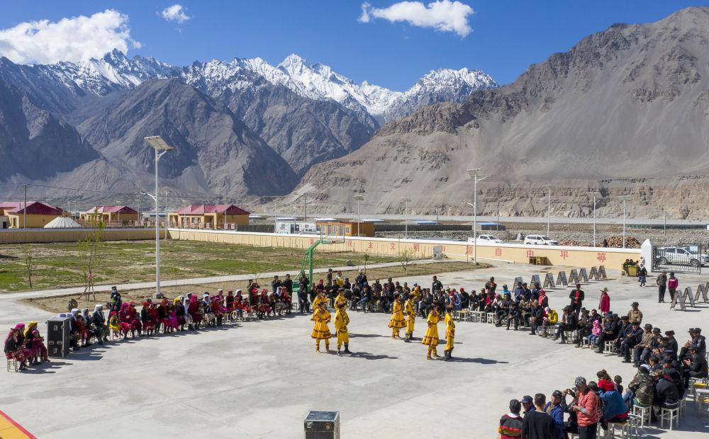 2020年6月6日,新疆塔什庫爾干塔吉克自治縣文工團(tuán)演員在達(dá)布達(dá)爾鄉(xiāng)的一個(gè)山村為村民表演舞蹈節(jié)目(無人機(jī)照片)。塔縣文工團(tuán)成立于1956年,現(xiàn)有工作人員100余人,是活躍于新疆帕米爾高原上的“文藝輕騎兵”。在自然環(huán)境嚴(yán)酷的高原,塔縣文工團(tuán)演員們常年堅(jiān)持送文化進(jìn)山村、到牧場(chǎng),宣講惠民政策,用文藝演出豐富村民的精神文化生活。