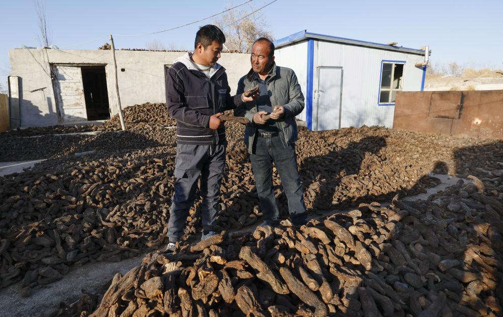 2024年12月4日,新疆民豐縣尼雅鎮(zhèn)甫甫克村村民麥麥提(右)同前來收購大蕓的商戶交流。自20世紀(jì)末新疆全面開展防風(fēng)治沙工程并大力推進(jìn)沙產(chǎn)業(yè)以來,麥麥提從在合作社挖大蕓賺工錢,到后來主動(dòng)學(xué)習(xí)大蕓種植技術(shù)并創(chuàng)業(yè),一路走來小有收獲。2018年,他承包了10畝沙地種紅柳、大蕓。紅柳茁壯成長,大蕓產(chǎn)量頗豐,麥麥提年收入超過5萬元。