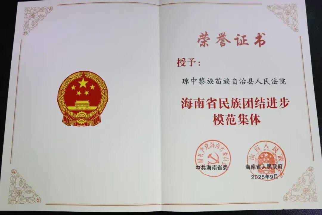 2025年9月25日,海南省民族團結(jié)進步表彰大會在海口召開。瓊中黎族苗族自治縣人民法院榮獲“海南省民族團結(jié)模范集體”榮譽稱號。