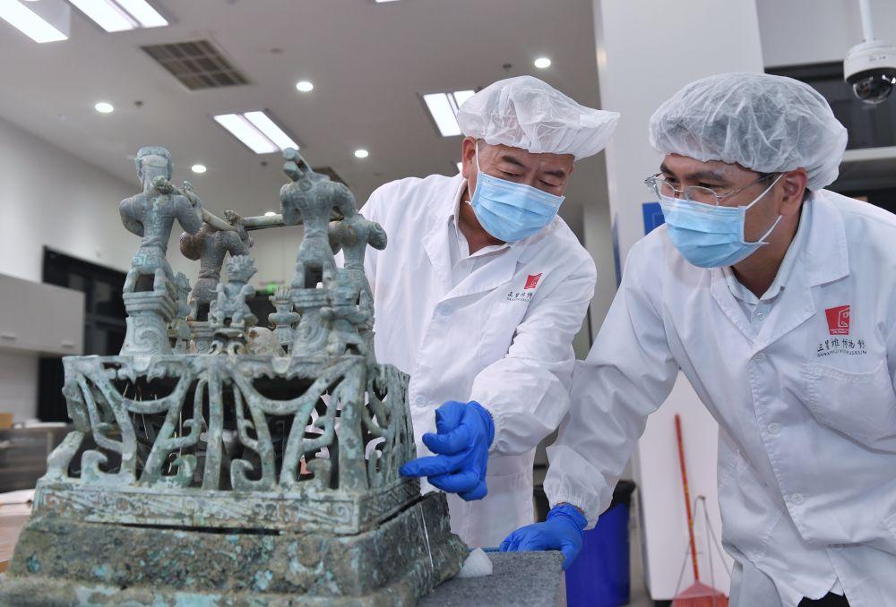 2023年5月30日,在四川三星堆博物館文物保護和修復(fù)中心,文物修復(fù)師郭漢中(左)與同事討論神壇底座修復(fù)方案。郭漢中從事文物修復(fù)工作已40余年,深度參與了三星堆祭祀坑的發(fā)掘工作,累計修復(fù)文物6000余件?!按蟾胚€有上萬件文物等著修復(fù),需要一代接著一代往下干?!惫鶟h中說,他要把平生所學傳承下去,培養(yǎng)更多人才。