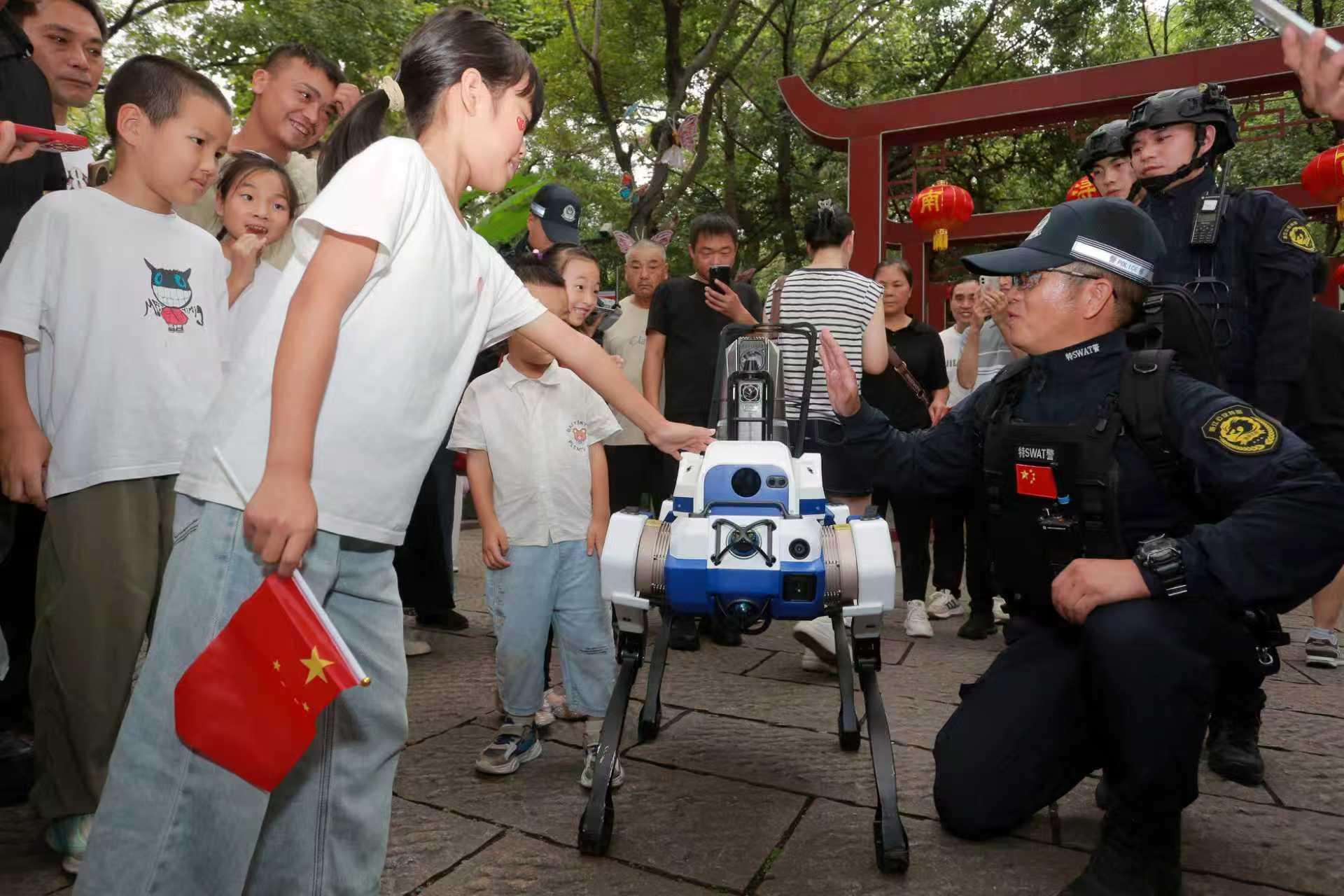近日,在浙江湖州南潯古鎮(zhèn)景區(qū)南大門的連廊里,一群孩子手拿國(guó)旗,圍著一只機(jī)器狗歡呼雀躍,時(shí)不時(shí)還合影打卡?!八木幪?hào)是D007。”一旁的特警隊(duì)員一邊配合著拍照,一邊詳細(xì)介紹這位“新戰(zhàn)友”。