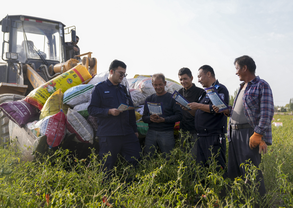 圖為10月12日,輪臺(tái)縣公安局阿克薩來(lái)鄉(xiāng)派出所民輔警深入田間地頭開展反詐普法宣傳。