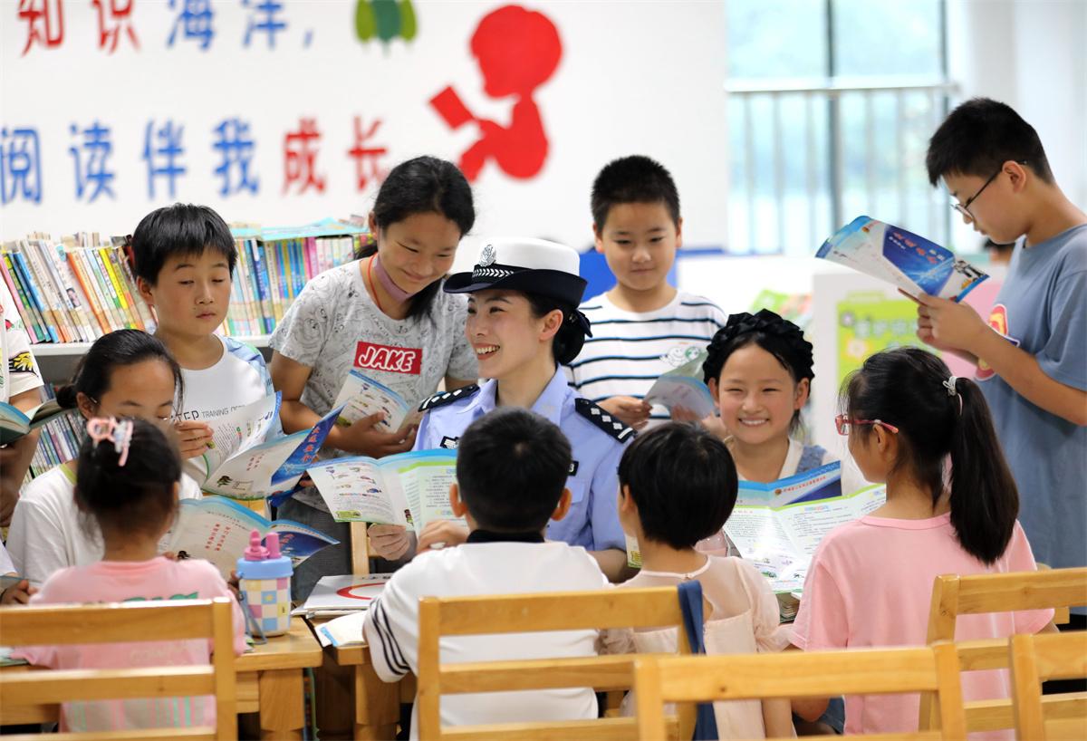 7月13日,安徽省舒城縣公安局交管大隊聯(lián)合城中派出所民警走進縣圖書館,向在此閱讀、休閑的市民宣傳交通安全知識,讓安全出行知識走近市民、貼近生活。