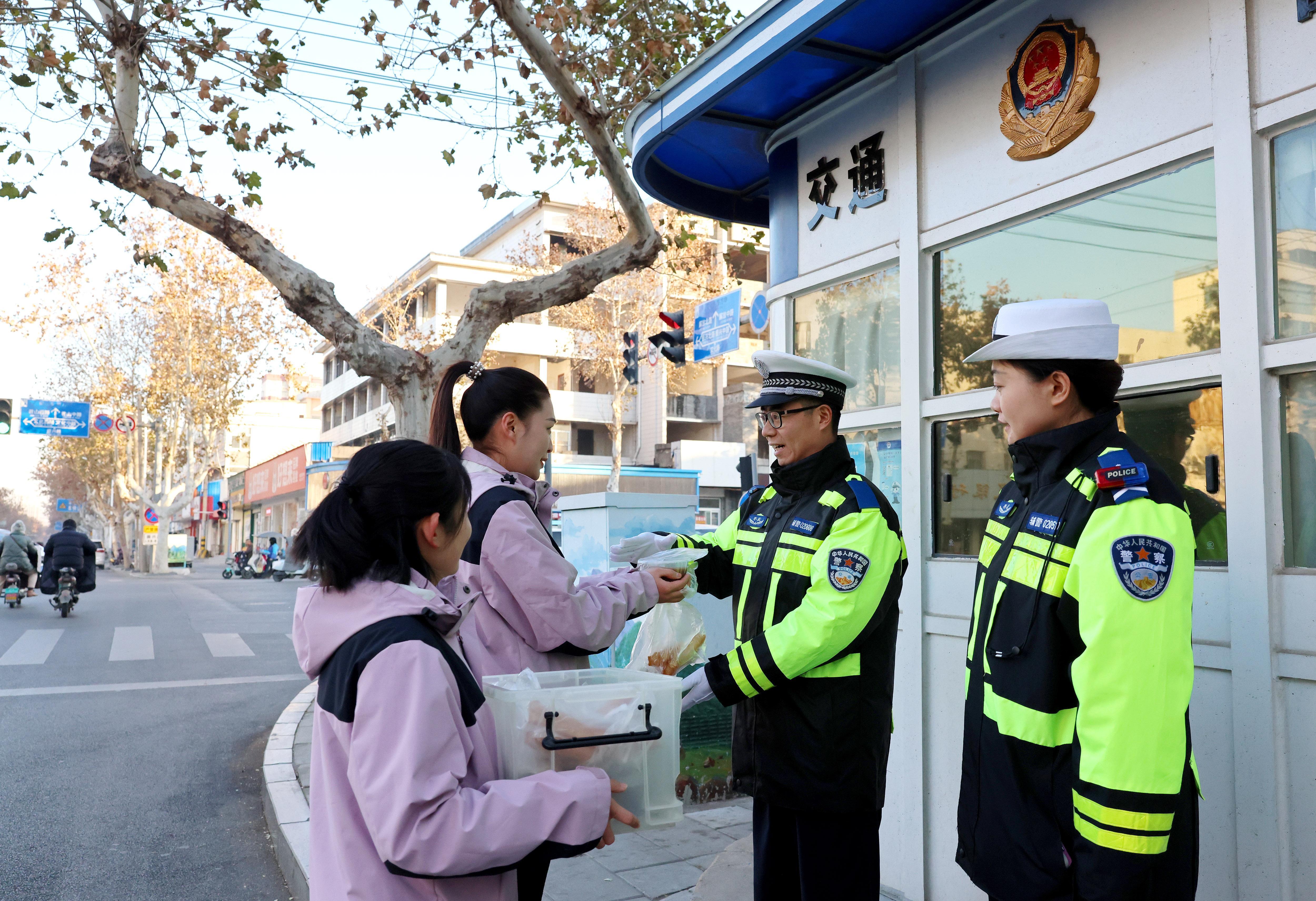1月7日,山東省棗莊市市中區(qū)文化路絲雨幼兒園老師向崗亭值班的交通輔警送上臘八粥。