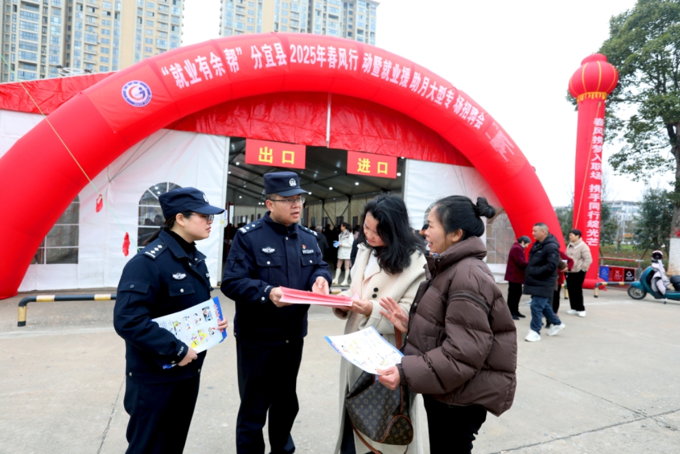 近日,江西省分宜縣公安局利用新春招聘會(huì)的有利契機(jī),組織民輔警開展“促進(jìn)就業(yè) 反詐同行”普法宣傳活動(dòng),通過(guò)發(fā)放宣傳單、案例講解、交流互動(dòng)等方式,向求職的群眾講解電信網(wǎng)絡(luò)詐騙防范技巧,為應(yīng)聘者上好求職防騙“第一課”。