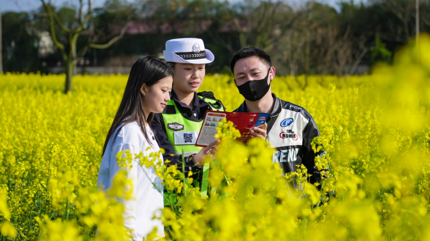 陽春三月,江西省新余市數(shù)萬畝油菜花競相綻放,吸引大批游客前來打卡拍照。新余市公安局交警支隊加強(qiáng)警力調(diào)度,開展巡邏防控,疏導(dǎo)交通秩序,并組織民警面對面向游客宣講交通安全法規(guī)。