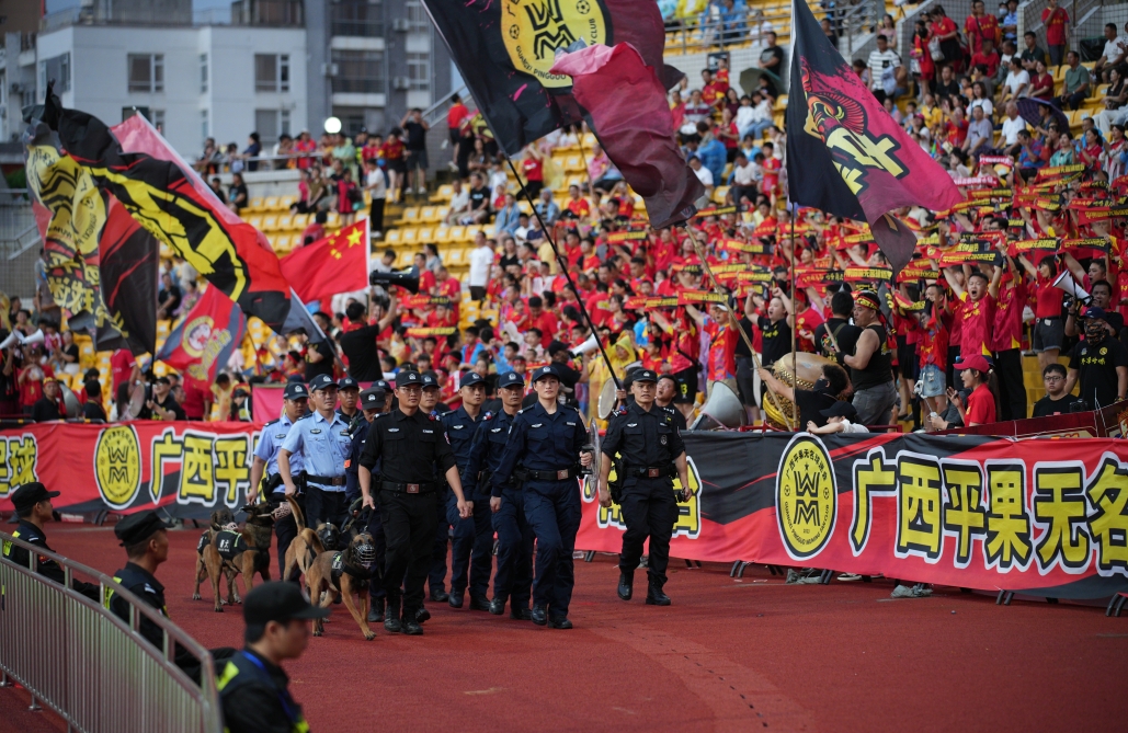 每逢平果市主場比賽日,各地球迷都會(huì)早早來到體育場外為球隊(duì)吶喊助威。而比球迷更早到達(dá)的,是平果市公安局的民輔警和安保人員。“每場比賽前,民警會(huì)提前4個(gè)小時(shí)到達(dá)現(xiàn)場開展安全排爆工作。場內(nèi)近3萬個(gè)座位、每一條過道、每一個(gè)看臺,以及場外的每一個(gè)重點(diǎn)區(qū)域,我們都要認(rèn)真排查。”平果市公安局副局長黃漢杰說。