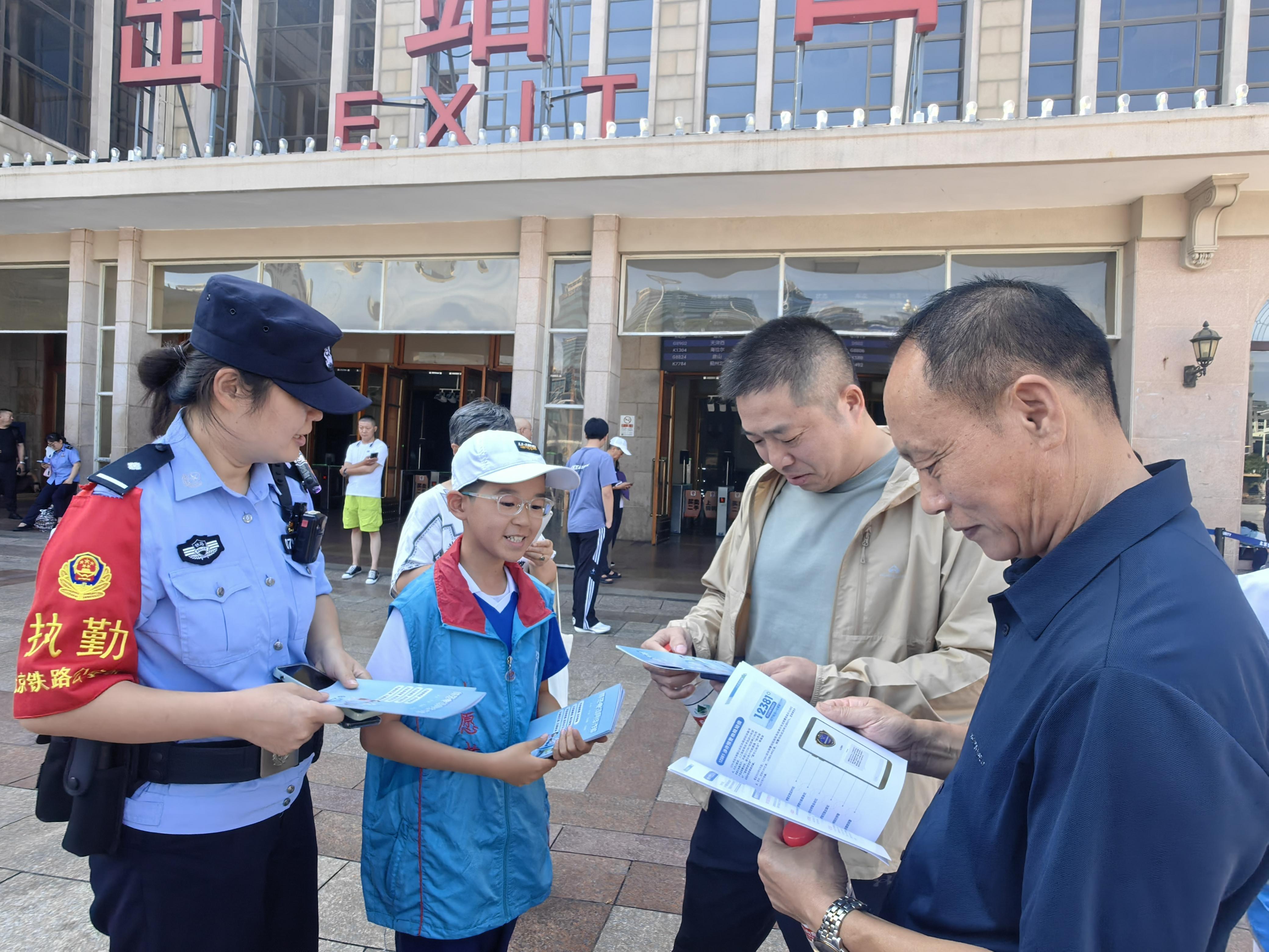 圖為經(jīng)過培訓(xùn)的小志愿者,在派出所民警和管委會工作人員的帶領(lǐng)下,主動向過往旅客發(fā)放宣傳資料。