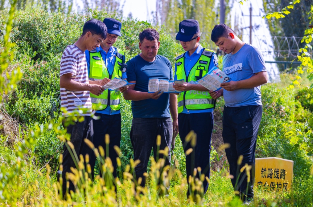 近日,新疆喀什地區(qū)鐵路線路周邊無花果、葡萄相繼迎來“豐收季”,烏魯木齊鐵路公安局喀什公安處組織民輔警走進(jìn)田間地頭、林圃果園,開展“鐵警護(hù)豐收 助農(nóng)話安全”普法宣傳活動,通過警用車載喇叭播放鐵路安全知識、開展矛盾糾紛排查化解工作、現(xiàn)場普法答疑等方式,結(jié)合典型案例,向群眾普及鐵路安全知識,講解電信網(wǎng)絡(luò)詐騙類型及防范技巧,為“采摘季”增添安全保障,全力守護(hù)群眾“錢袋子”。