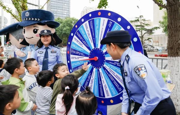 圖為民警通過趣味轉(zhuǎn)盤向市南區(qū)悅府幼兒園小朋友普及日常食品安全知識(shí)