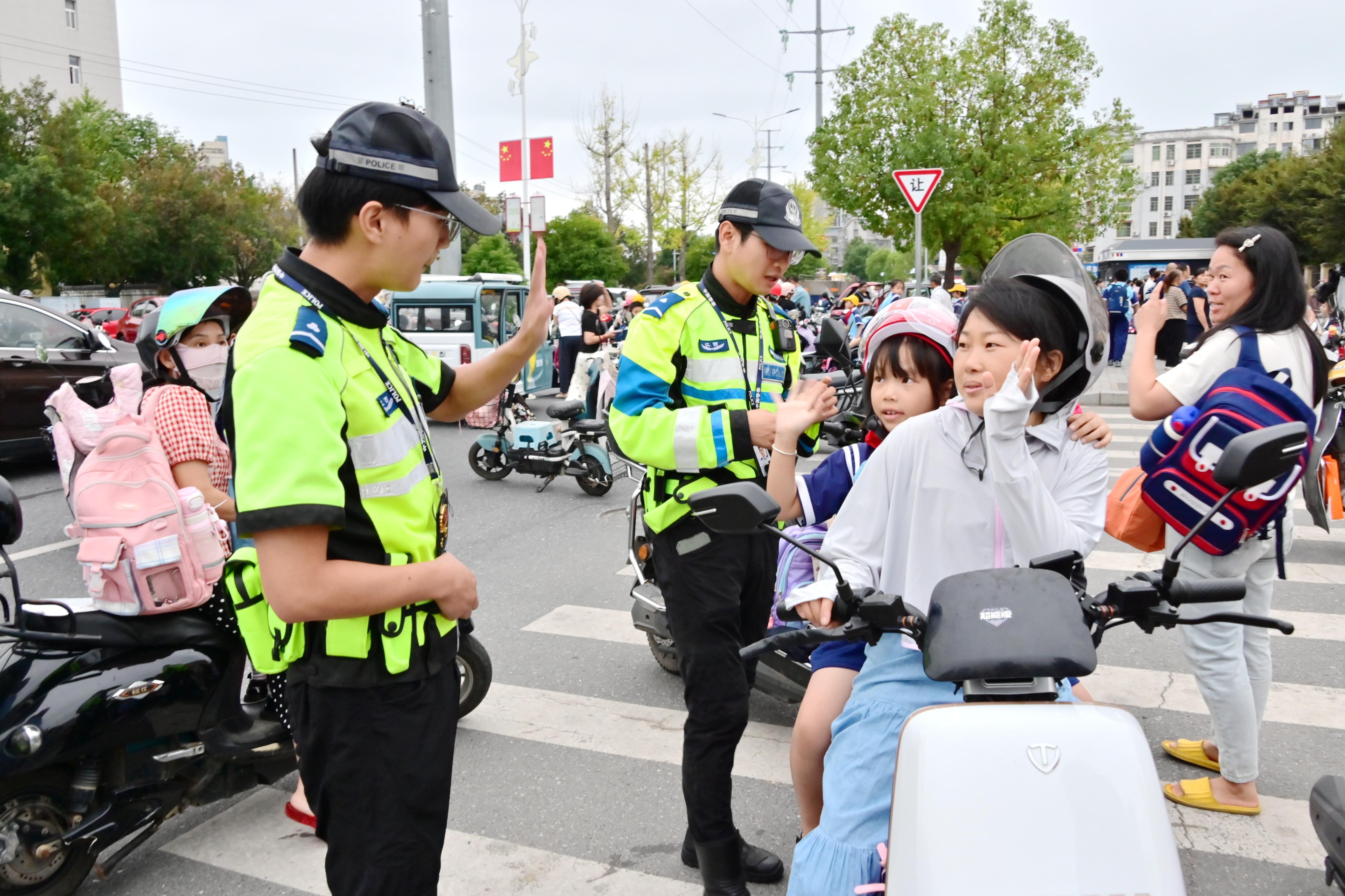 圖為10月13日,武寧交警“鐵騎”隊(duì)員在武寧縣第四小學(xué)開展文明交通勸導(dǎo)活動。