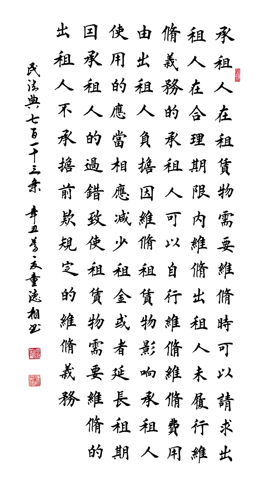 民法典第七百一十三條 承租人在租賃物需要維修時(shí)可以請求出租人在合理期限內(nèi)維修。出租人未履行維修義務(wù)的,承租人可以自行維修,維修費(fèi)用由出租人負(fù)擔(dān)。因維修租賃物影響承租人使用的,應(yīng)當(dāng)相應(yīng)減少租金或者延長租期。