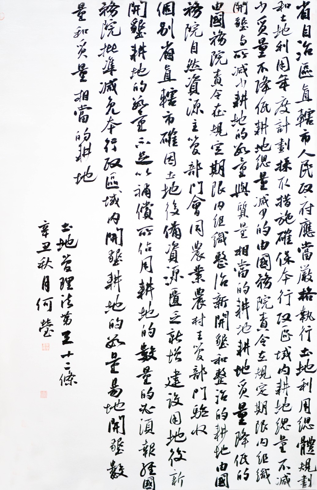 繼1600余位書法家參與書寫《中華人民共和國民法典》全部1260條法條之后,法治日報社聯(lián)合自然資源部法規(guī)司、自然資源部書畫研究會和北京昌平書法家協(xié)會,將筆端對準土地管理“一法一條例”,即《中華人民共和國土地管理法》和《中華人民共和國土地管理法實施條例》。
