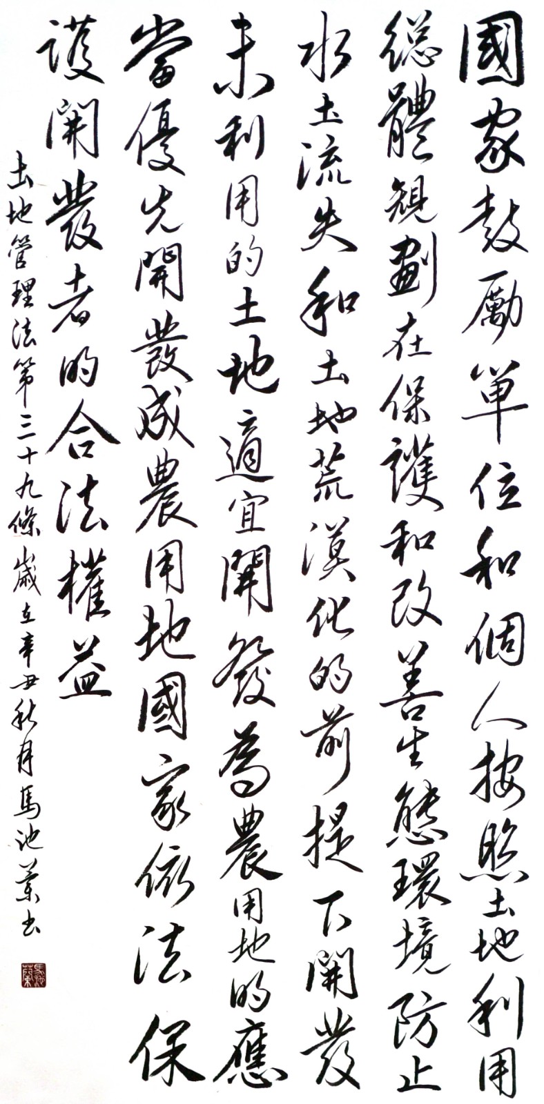 繼1600余位書法家參與書寫《中華人民共和國民法典》全部1260條法條之后,法治日報社聯(lián)合自然資源部法規(guī)司、自然資源部書畫研究會和北京昌平書法家協(xié)會,將筆端對準(zhǔn)土地管理“一法一條例”,即《中華人民共和國土地管理法》和《中華人民共和國土地管理法實施條例》。
