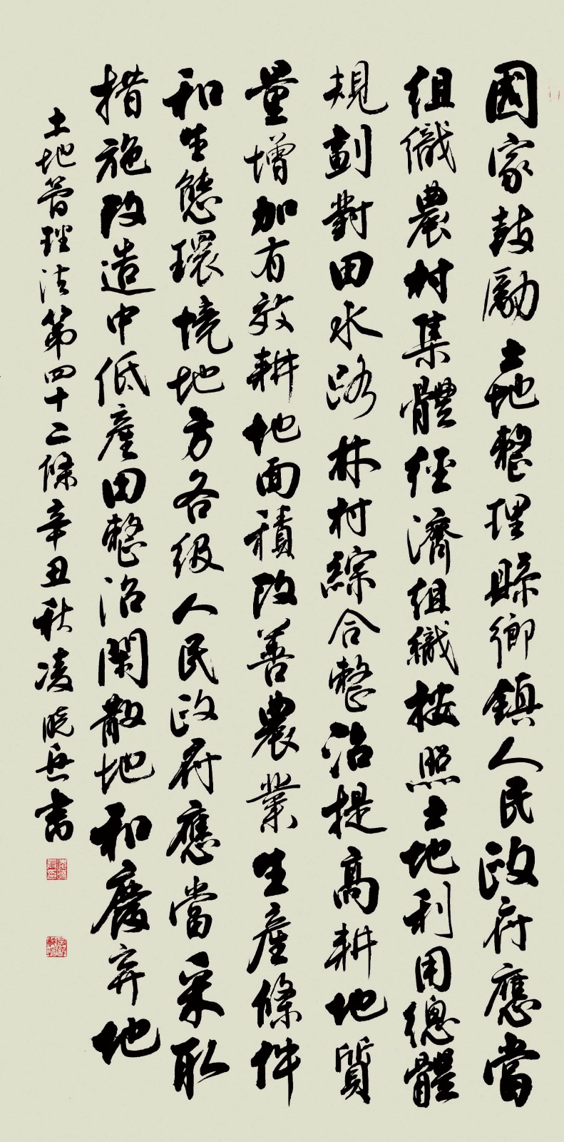 繼1600余位書法家參與書寫《中華人民共和國民法典》全部1260條法條之后,法治日報(bào)社聯(lián)合自然資源部法規(guī)司、自然資源部書畫研究會和北京昌平書法家協(xié)會,將筆端對準(zhǔn)土地管理“一法一條例”,即《中華人民共和國土地管理法》和《中華人民共和國土地管理法實(shí)施條例》。