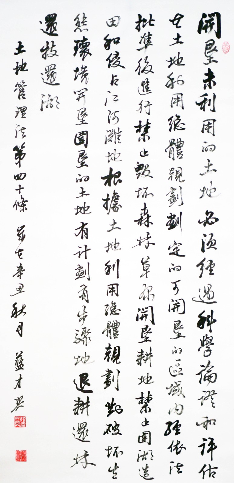 繼1600余位書法家參與書寫《中華人民共和國民法典》全部1260條法條之后,法治日報社聯合自然資源部法規(guī)司、自然資源部書畫研究會和北京昌平書法家協會,將筆端對準土地管理“一法一條例”,即《中華人民共和國土地管理法》和《中華人民共和國土地管理法實施條例》。