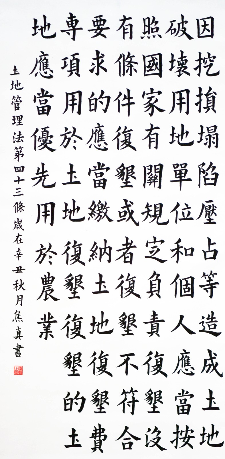 繼1600余位書法家參與書寫《中華人民共和國民法典》全部1260條法條之后,法治日?qǐng)?bào)社聯(lián)合自然資源部法規(guī)司、自然資源部書畫研究會(huì)和北京昌平書法家協(xié)會(huì),將筆端對(duì)準(zhǔn)土地管理“一法一條例”,即《中華人民共和國土地管理法》和《中華人民共和國土地管理法實(shí)施條例》。